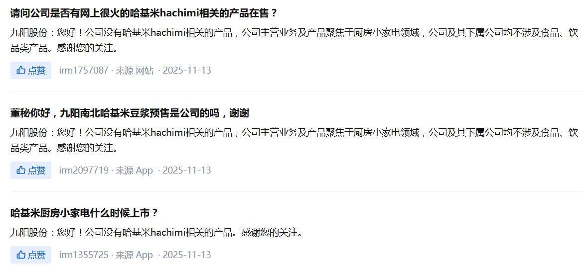 11月13日盘中,九阳股份董秘紧急澄清,称公司没有哈基米hachimi相关的产品,公司主营业务及产品聚焦于厨房小家电领域,公司及其下属公司均不涉及食品、饮品类产品。